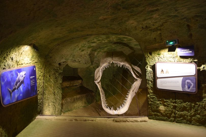 Scénographie avec la reconstitution de la machoire d'un otodus megalodon |