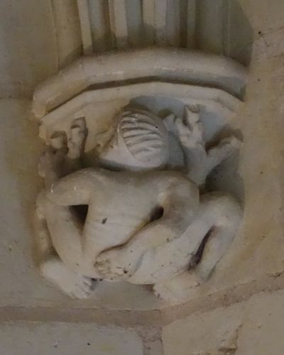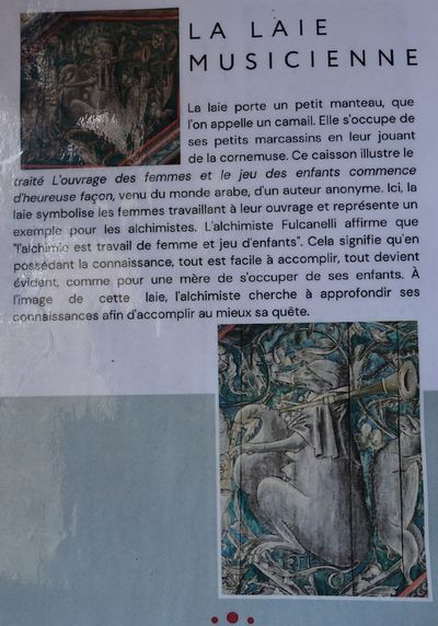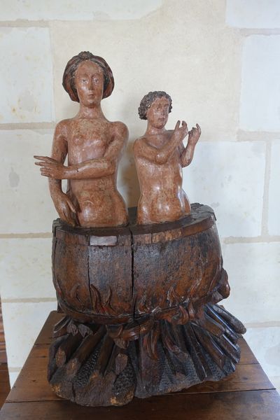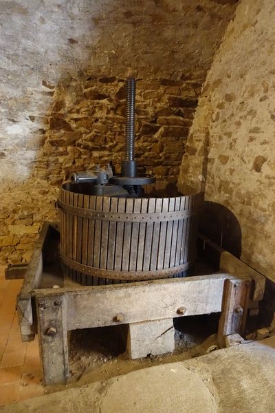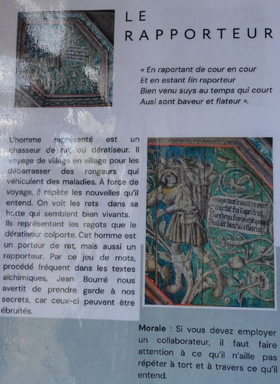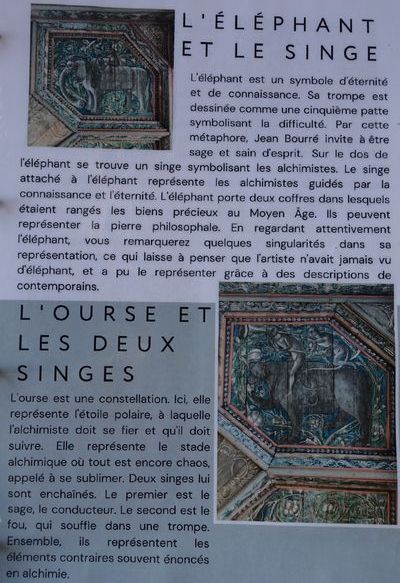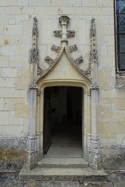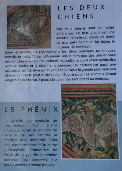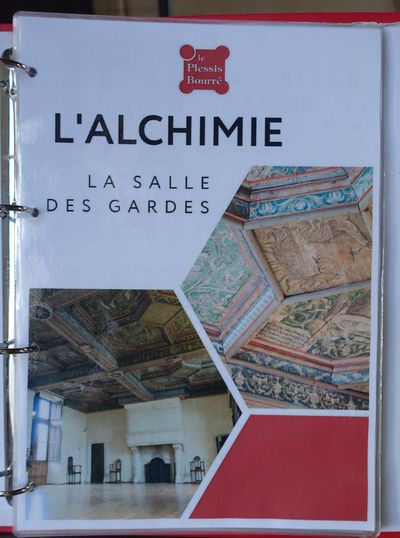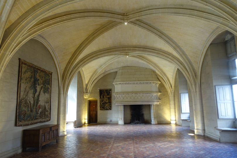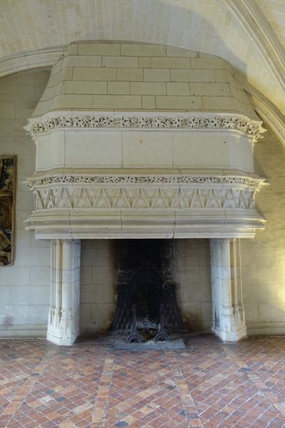 Cheminée monumentale en tuffeau ornée de trois frises: feuille de vigne illustrant l'activité viticole de la région; feuille de chêne, symbole du pouvoir seigneurial; triangle, symbole alchimique: le sel, le mercure et le soufre mais également : la terre, l'eau et le feu. |