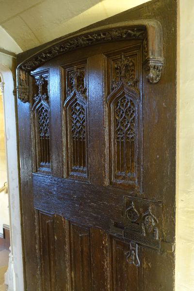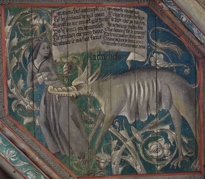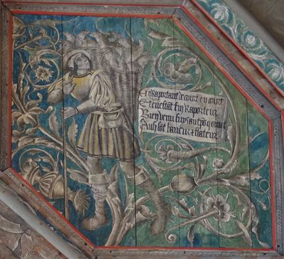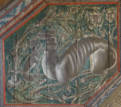 Vue d'ensemble (côté droit en entrant) avec charpente en forme de carène de navire renversée. |