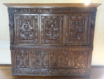 Vue d'ensemble. Mobilier de style Renaissance. A droite, siège dit dagobert, ancêtre de la chaise pliante. |