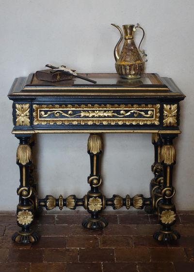 Conçu pour être employé assis de côté, un genou sous la surface d'écriture et l'autre en dehors, le bureau Mazarin est adapté aux membres de la noblesse qui portaient l'épée à gauche.