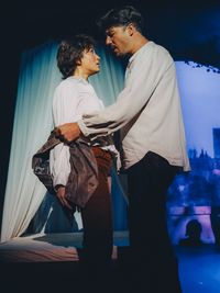 PEAU D’HOMME d’après la bande dessinée «Peau d’homme» de Hubert et Zanzim. Adaptation et mise en scène Léna Bréban. Assistante à la mise en scène Ambre Reynaud. Chansons Ben Mazué. Lumières Denis Koransky. Création sonore Victor Belin, Raphaël Auclair. Chorégraphie Leïla Ka. Décor Juliette Azzopardi, Jean-Benoît Thibault. Costumes Alice Touvet. Avec Pauline Cheviller, Valentin Rolland, Emmanuelle Rivière, Camille Favre-Bulle ou Léna Bréban, Vincent Vanhée, Aurore Streich, Adrien Urso, Régis Vallée ou Jean-Baptiste Darosey, Clément Simounet ou Clément Dewitt.