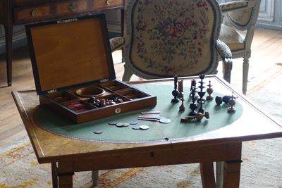 Conçu pour être employé assis de côté, un genou sous la surface d'écriture et l'autre en dehors, le bureau Mazarin est adapté aux membres de la noblesse qui portaient l'épée à gauche.