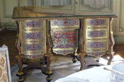 Ce bureau Mazarin du XIXe siècle est recouvert de marqueterie Boulle, du nom d'André-Charles Boulle (1642-1732), célèbre ébéniste de Louis XIV. Il porta la technique de marqueterie au paroxysme de sa finesse par l'utilisation d'écailles de tortue (partie rouge) associées à du métal (du laiton, partie doré et de l'étain, partie grise). Le modèle présenté ici a été restauré en 2023. Les écailles de tortue manquantes ont été remplacées par une résine spéciale qui semble identique aux vraies. |