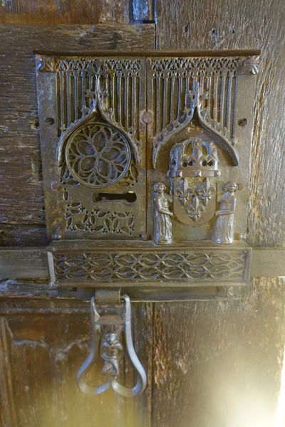 Porte d'entrée, détail: sur la serrure les armoiries royales; sur la poignée un singe qui est le symbole de la malice alchimique. |