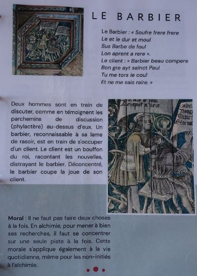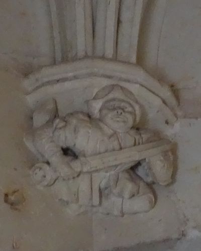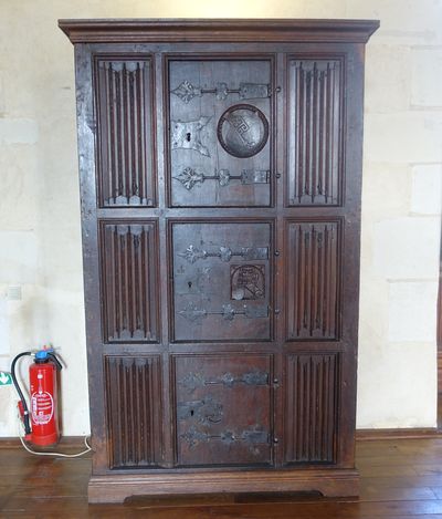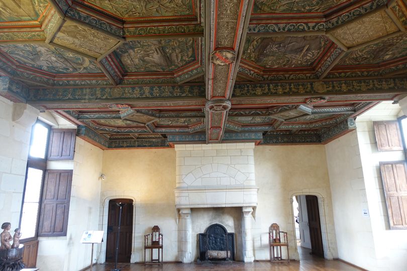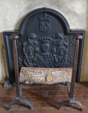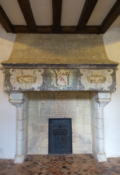 Cheminée monumentale en tuffeau ornée de trois frises: feuille de vigne illustrant l'activité viticole de la région; feuille de chêne, symbole du pouvoir seigneurial; triangle, symbole alchimique: le sel, le mercure et le soufre mais également : la terre, l'eau et le feu. |