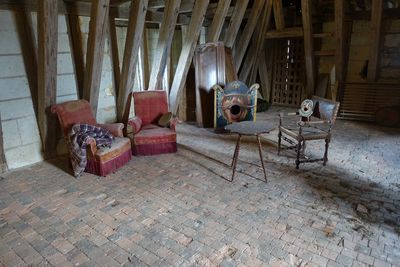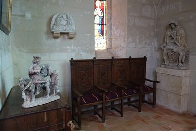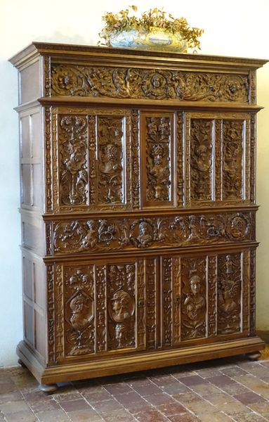 Vue d'ensemble. Mobilier de style Renaissance. A droite, siège dit dagobert, ancêtre de la chaise pliante. |