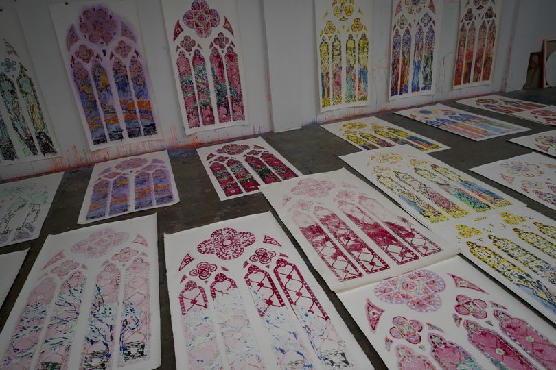 Pour les vitraux de Notre Dame, j'ai voulu être très proche des cartons que vont réaliser les maîtres verriers en créant des maquettes à taille réelle d'environ 7 mètres de haut. La technique du monotype s'est imposée, comme une évidence (...). Elle offre une liberté radicale et en même temps une rigueur tranchée - une dualité qui fait écho à la matérialité du verre dans l'art du vitrail, à la fois organique et ciselée.