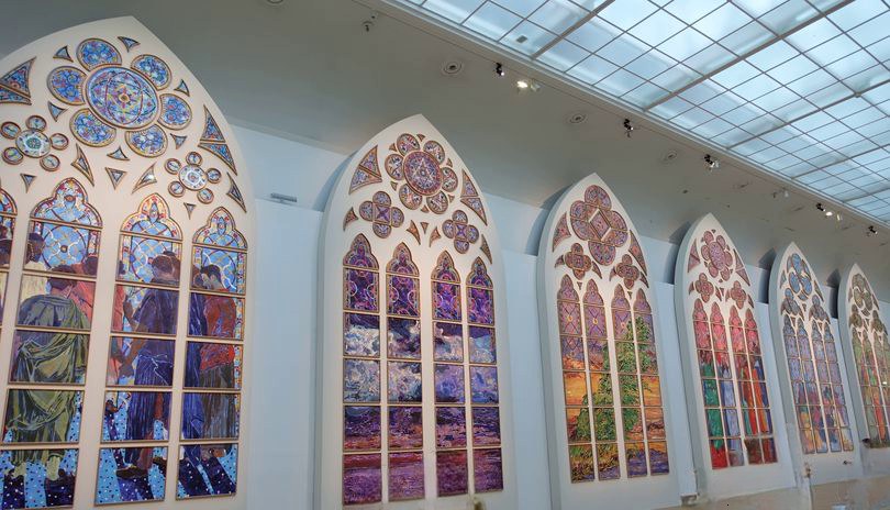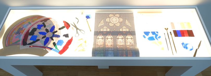 Vitrine dédiée au travail de maîtres-verriers de l'Atelier Simon-Marq. |