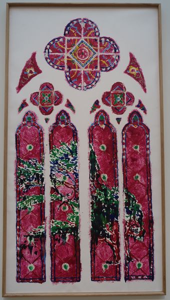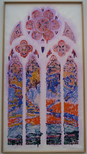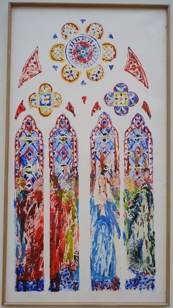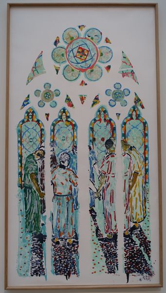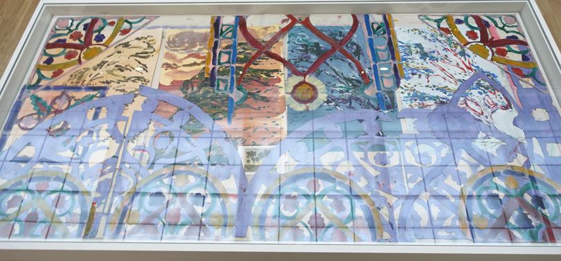 Impression à l'échelle 1 de la maquette de l'artiste. Ce document de travail intègre les impératifs techniques propres à l'art du vitrail (iconographie, composition, couleur, serrurerie, pierre).