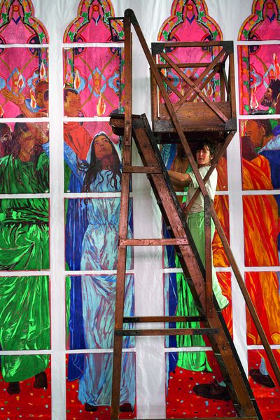 Claire Tabouret devant la maquette de la baie pour la chapelle Sainte-Geneviève, à l’atelier Simon-Marq. © Claire Tabouret / photo Nathan Thelen, 2025. |