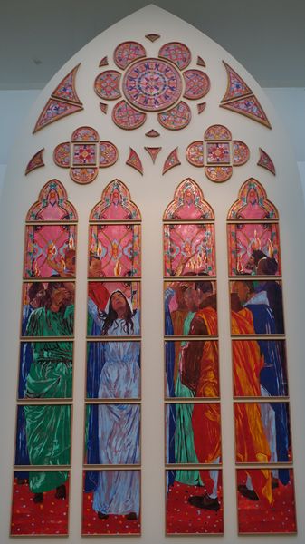 Baie de la chapelle Saint Joseph. « Tous réunis ensemble dans un même un lieu ». 60 encres sur papier assemblées, dimension totale: 700 x 400 cm.