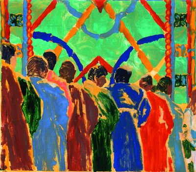Claire Tabouret. Esquisse. Étude pour la baie de la chapelle Saint-Joseph, 2024. Encre et acrylique sur papier, 199,7 x 108 cm. |