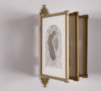 (10) Eva Jospin. Dessin laiton, 2025. Laiton, encre de chine sur papier, plexiglass, 30 x 17 x 3 cm.