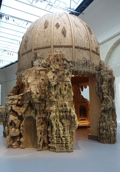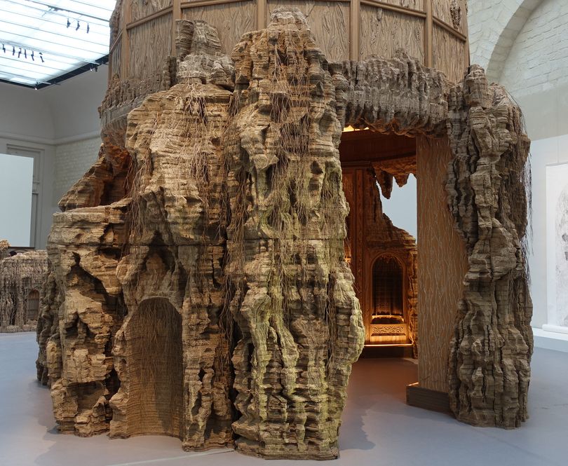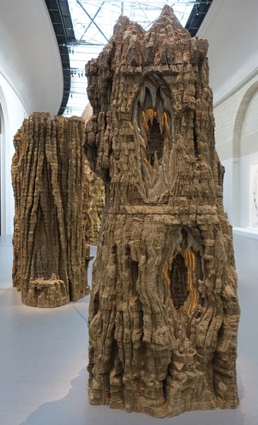 (2) Eva Jospin. Cénotaphe, 2020. Bois, carton, coquillages, papiers colorés, liège, laiton, 483 x 300 x 300 cm. Courtesy Eva Jospin.