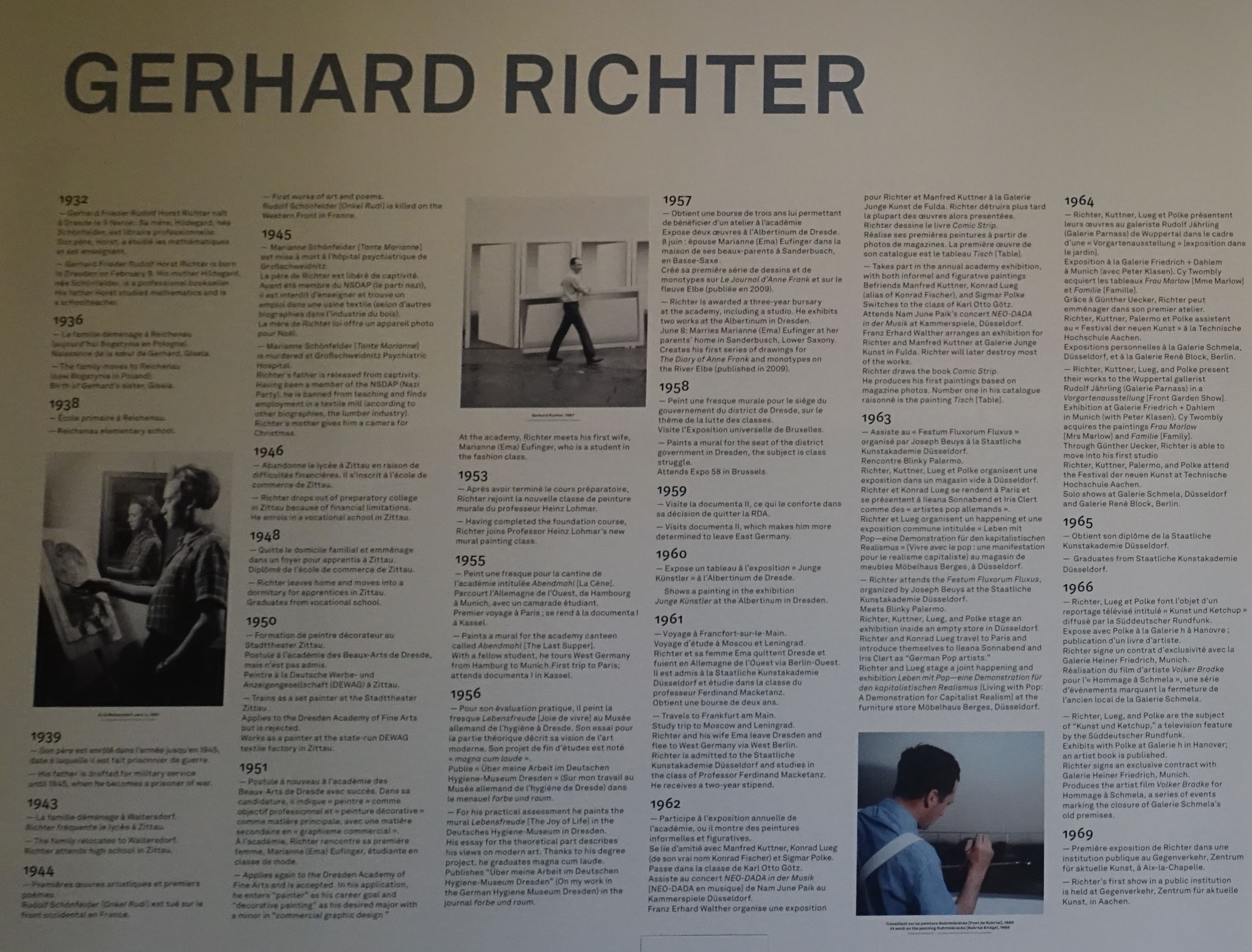 Gerhard Richter naît à Dresde en 1932. Durant la Deuxième Guerre mondiale, sa famille s’installe à Waltersdorf, en Lusace. En 1951, Richter entre à l'Académie des beaux-arts de Dresde. Il y rencontre Marianne (Ema) Eufinger, qu'il épouse en 1957. En 1956, il peint comme travail de diplôme la fresque Lebensfreude [Joie de vivre] au Deutsches Hygiene-Museum de Dresde. Une bourse lui permet de rester à l’université pendant trois ans. En 1959, une visite à la documenta ll à Kassel le décide à quitter l'Allemagne de l'Est.