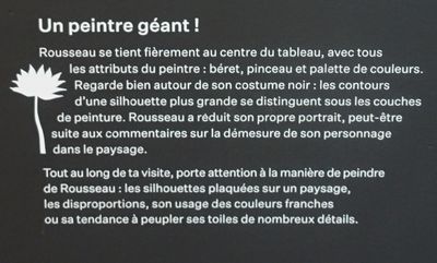 Rousseau décline les motifs stéréotypés qu'il puise dans la presse et les ouvrages illustrés: un homme vêtu d’un pagne et d’une coiffe; une silhouette noire sans traits distinctifs. Le traitement fantaisiste de la végétation, sans réelle profondeur, lui donne un aspect décoratif. Les tons pourpres de la haie d’arbustes soulignent ses qualités de coloriste et font écho à ceux employés dans Forêt tropicale avec jungles. |