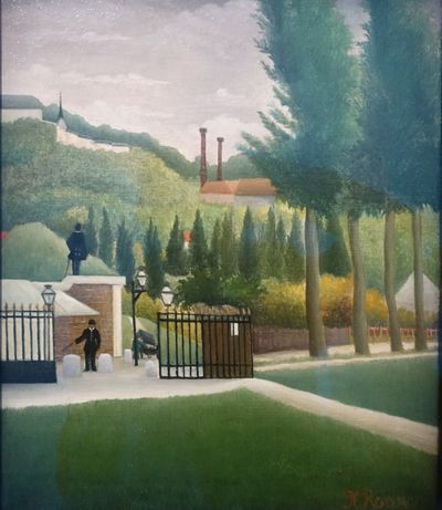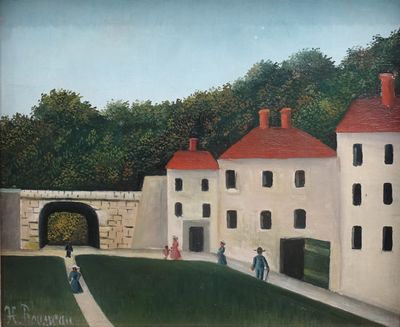 Pendant vingt-deux ans, Rousseau est employé aux services de l'octroi. Il y collecte l’impôt sur les marchandises entrant dans Paris, et peint sur son lieu de travail à ses heures perdues. Il ne représente pas ici un emplacement précis. Les fortifications aux portes de la ville, les bornes en pierre ou les uniformes des deux silhouettes évoquent ce poste qui lui vaudra le surnom de «douanier». |