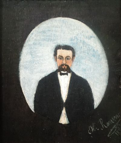 Ce portrait est l’un des plus imposants réalisés par Rousseau. La frontalité du modèle et le décor de rideau évoquent les portraits photographiques de l’époque. Parmi les fleurs en pot, les pensées font probablement allusion à une passion amoureuse. Ce goût du détail symbolique est apprécié par Pablo Picasso, qui le décrit comme l’un «des plus véridiques portraits psychologiques français». Il l’achète pour une somme dérisoire en 1908, et le met à l'honneur lors du banquet qu’il organise pour Rousseau dans son atelier du Bateau-Lavoir, contribuant ainsi à forger sa légende. |