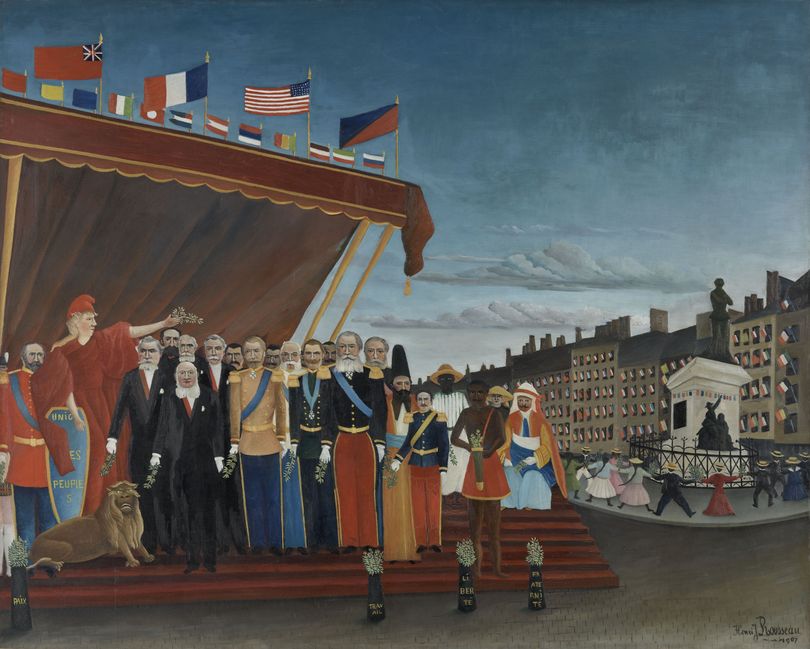 Dans cette œuvre, Rousseau manifeste son attachement aux valeurs républicaines. Il réunit sous l'égide de Marianne le président de la République française Armand Fallières, en poste depuis 1906, aux côtés de dignitaires politiques venus d'Europe, du Moyen-Orient ou de l’Afrique du Nord. La toile attire les regards au Salon, dont la date coïncide avec la seconde conférence de La Haye pour la paix. Le peintre nourrit alors l’espoir d’un achat par l’État. C’est finalement le marchand Ambroise Vollard qui en fait l’acquisition, puis Pablo Picasso, qui la conservera toute sa vie.