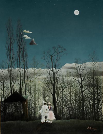 Cette œuvre est l’une des premières que Rousseau envoie au Salon des Indépendants. Tout dans son traitement témoigne de la volonté du peintre de faire ses preuves: le travail de la profondeur, les ombres projetées au sol et «la richesse des tons» remarquée par le peintre Camille Pissarro. Le sujet reste mystérieux: on reconnaît Pierrot et Colombine en costumes, épiés par un profil à peine visible sous l’auvent. Peut-être un hommage à Gérôme, et à sa célèbre Suite d’un bal masqué (1857), cette toile affirme surtout son goût pour les scènes nocturnes et les promenades costumées. |