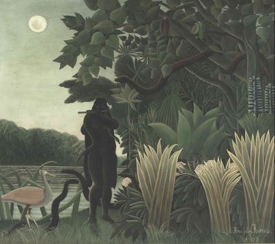 Pour cette composition, Rousseau s'inspire d’une illustration publiée dans la presse, dont il modifie le décor. Il ajoute une végétation luxuriante où abondent bananes, fruits et fleurs. Suite au succès critique rencontré au Salon des Indépendants, Rousseau décline son sujet dans un plus petit format, pour répondre à une généreuse commande. Le tableau reste pourtant invendu et Rousseau se voit contraint de brader les deux versions auprès du marchand Ambroise Vollard. |
