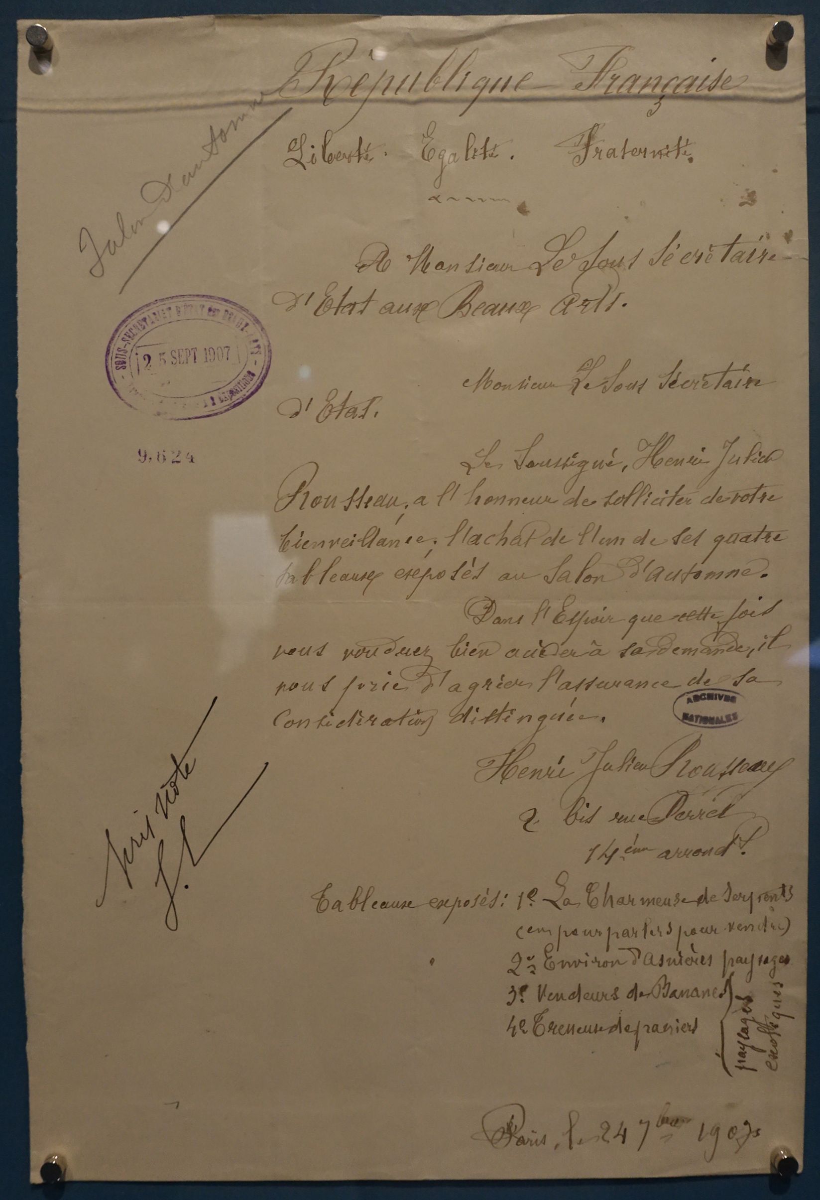 Henri Rousseau. Lettre au sous-secrétaire d’État aux Beaux-Arts, 24 septembre 1907. Paris, Archives nationales de France.