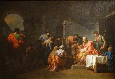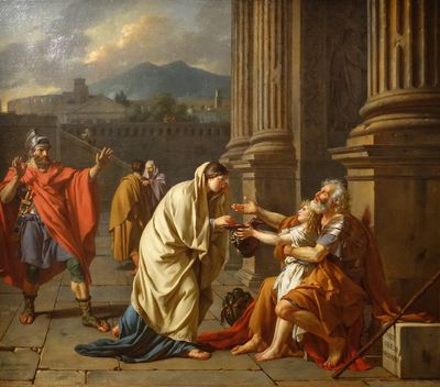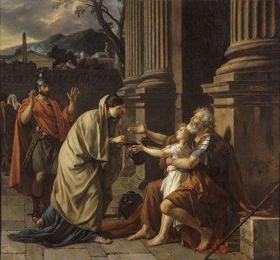 Victime de l'injustice de l’empereur romain Justinien, Bélisaire, général byzantin du 6e siècle, est aveuglé et condamné à mendier. Pour son agrément à l’Académie, David s’inspire d’un roman de Jean-François Marmontel (1723-1799) qui avait été interdit pour des raisons politiques en 1767. Avec cette œuvre, il entend rivaliser avec Vincent et Peyron, dont les toiles sur le même thème avaient été saluées par la critique en 1777 et 1779. |