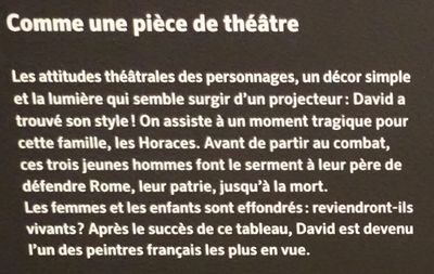 Avec cette œuvre réduite à l'essentiel, il révolutionne la peinture par la sévérité de son style, la force de la gestuelle et du chromatisme, l’archaïsme de l'architecture, et le strict rythme ternaire. En opposant l’action des hommes à la douleur des femmes, il confronte l’héroïsme au sacrifice qu’il implique. Sa peinture n’est pas illustrative, elle invite à la réflexion. |