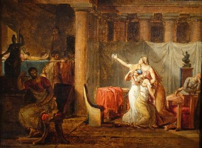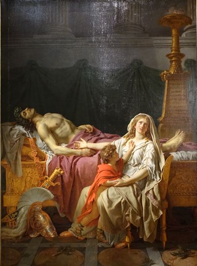 Andromaque veille le cadavre de son époux Hector et protège son fils Astyanax. Le centre de la composition n'est pas, comme attendu, le héros auquel on rend hommage, mais la douleur d’Andromaque. Pour la première fois, David illustre le prix à payer pour l’héroïsme, un prix payé par les femmes. Il réalise la fusion de la noblesse grave inspirée de Nicolas Poussin (1594-1665) et de la sensibilité, redevable à l'art de Jean-Baptiste Greuze (1725-1805), en ajoutant une touche de réalisme dans la représentation du cadavre raidi. On notera le coloris audacieux. |