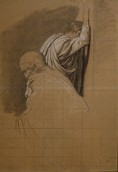 Jacques-Louis David. Les Trois Horaces, étude pour Le Serment des Horaces, vers 1784. Pierre noire (en partie estompée), pinceau, lavis gris et rehauts de blanc, mis au carreau à la pierre noire. Bayonne, musée Bonnat-Helleu. |