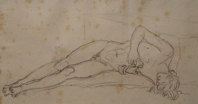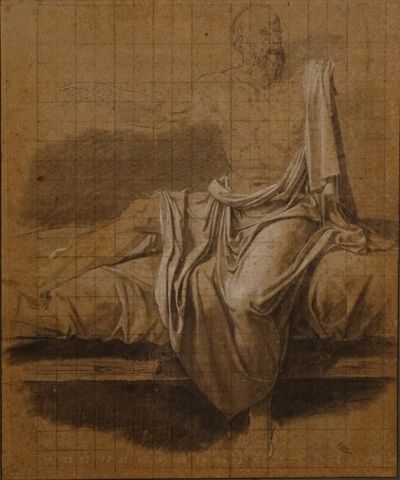 Jacques-Louis David. Socrate assis sur un lit, à demi nu, étude pour La Mort de Socrate, vers 1787. Pierre noire, estompe et rehauts de blanc, mis au carreau à la pierre noire. Bayonne, musée Bonnat-Helleu. |