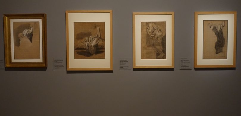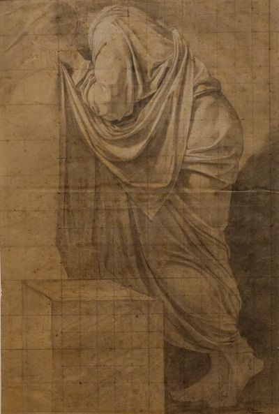 Jacques-Louis David. Figure de Camille, étude pour Le Serment des Horaces, vers 1784. Pierre noire estompée, pinceau, lavis gris et rehauts de blanc, mis au carreau à la pierre noire. Bayonne, musée Bonnat-Helleu. |