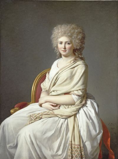 Très tôt, David peint des portraits frappants de vérité, marqués par un goût pour la description, comme ceux de ses beaux-parents, les Pécoul. Puis, il soumet son art à une forme d'épure, en rupture avec l'élégance flatteuse des effigies de Vigée-Lebrun. Éliminant tout accessoire, refusant toute mise en scène, il magnifie l’artifice de la pose d’atelier et s'attache à traduire par son pinceau la singularité de ses modèles se détachant sur un fond neutre et vibrant. Les portraits de Mme Thélusson et Mme d’Orvilliers en sont les chefs-d’œuvre, tout comme celui inachevé de Mme Trudaine, peint en 1791, aux couleurs de la Révolution: le bleu, le blanc et le rouge. |