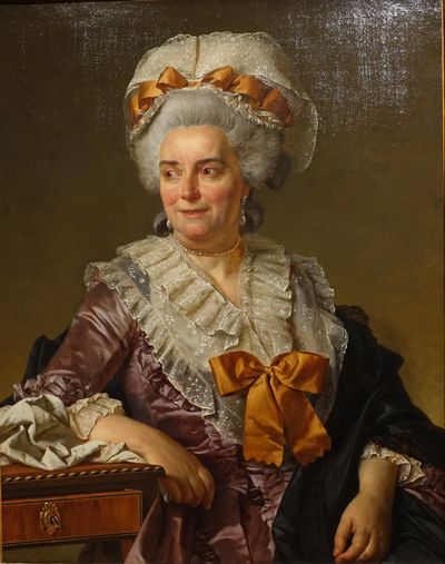 Le portrait de la belle-mère de David est un bel exemple de sa première manière, très réaliste, où il s'attache à rendre la psychologie de son modèle et décrire avec précision les accessoires et les éléments de costume. Il soumettra ensuite son art du portrait à une épure. |