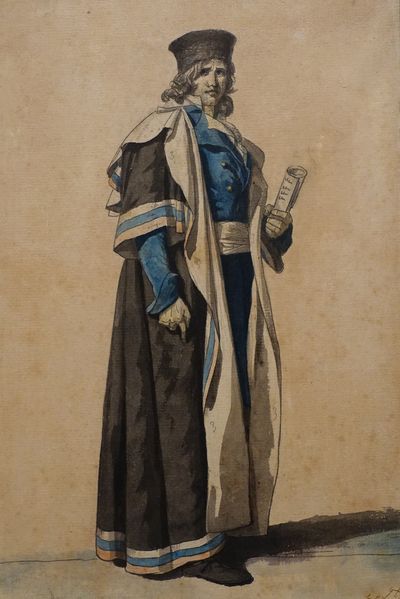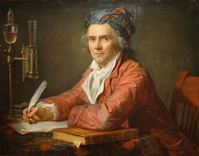 Après une carrière dans le négoce, l'Italien Filippo Mazzei s’installe en 1785 à Paris. David le rencontre probablement vers 1788 alors qu’il devient chargé d’affaires du roi de Pologne en France. En 1790 et 1791, Mazzei sert d’intermédiaire pour une commande royale de portraits d'hommes illustres, exécutés en grande majorité par les élèves de David. |