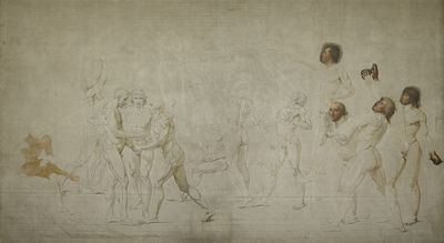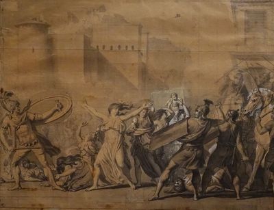 Jacques-Louis David. Les Sabines, esquisse, 1794-1795. Crayon noir, repris à la plume, encre noire, lavis gris et rehauts de blanc, mis au carreau au crayon noir. Paris, musée du Louvre, département des Arts graphiques.