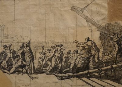 David aurait composé cette première esquisse des Sabines pendant sa captivité. Il combine des morceaux de papiers collés, avant de tracer une grille permettant de transposer le dessin sur un autre support: c'est ce que l’on appelle la mise au carreau. |