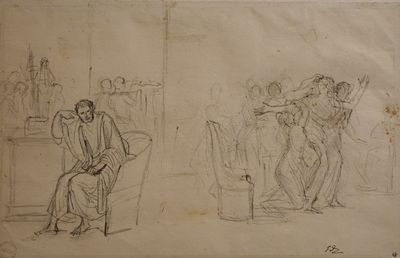 En 1773, David concourt pour la quatrième fois au Grand Prix: le sujet donné aux candidats cette année-là est le suicide du philosophe Sénèque, ordonné par l’empereur romain Néron en 65 après Jésus-Christ. Le jury décerne le prix à Peyron: son interprétation sobre du sujet était plus conforme aux attentes académiques que celle de David, jugée trop théâtrale et agitée. |