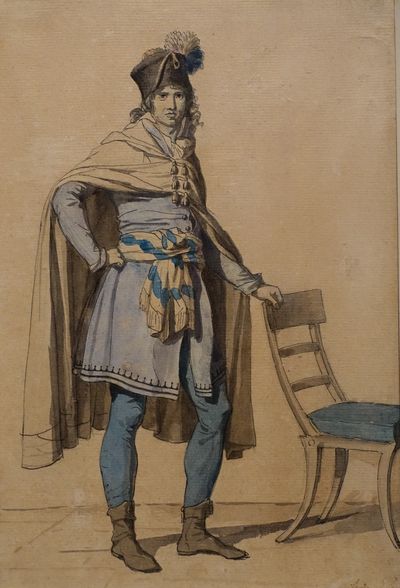 Issu de l’ancienne noblesse, le modèle a accompli toute sa carrière au service personnel de l’empereur Napoléon, jusqu’à son ultime défaite lors de la bataille de Waterloo en 1815. Temporairement replié à Bruxelles, le comte pose à deux reprises pour David, l’une en tenue de général de brigade et ici en costume civil. L’élégante redingote n’occulte cependant pas les décorations militaires ni, au fond du chapeau, les armoiries des marquis de Turenne. |