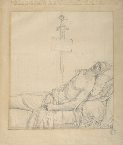 Jacques-Louis David. Un homme pleurant appuyé sur le montant d’un lit, étude pour La Mort de Socrate, vers 1787. Pierre noire, estompe et rehauts de blanc, mis au carreau à la pierre noire. Bayonne, musée Bonnat-Helleu. |