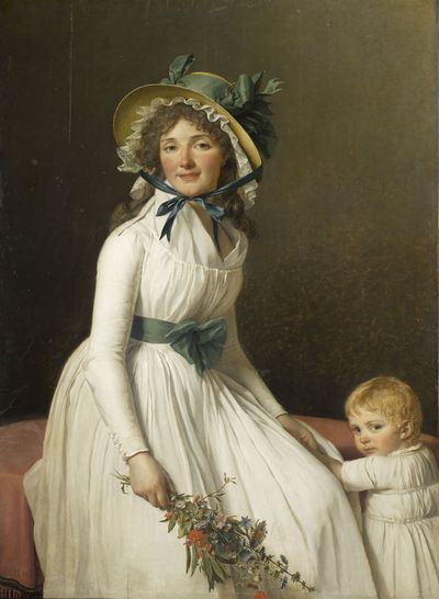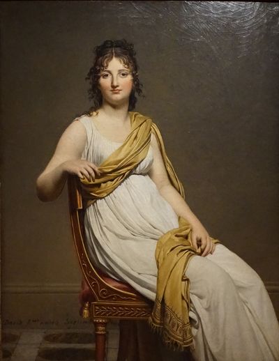 Mme David apparaît dans une toilette luxueuse, mais son sourire complice et la franchise avec laquelle sont peints ses traits diffèrent des portraits mondains. David reprend le prototype de Mme Thelusson (section 4 ci-dessus), mais en le retravaillant avec le réalisme sans concession de ses débuts. Il ne peint plus une beauté idéale, mais une femme réelle, intelligente et déterminée. Ce portrait consacre trente ans de mariage, interrompus par un court divorce de cinq ans sous la Révolution française. |