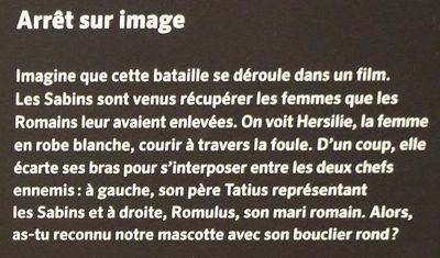 À la tête des femmes révoltées par la guerre, Hersilie s’interpose entre son père Tatius, roi des Sabins, à gauche, et son mari Romulus, premier roi légendaire de Rome, à droite. Six femmes et six enfants forment une couronne autour d'elle, exprimant la révolte, l'horreur, la supplication et le courage. David met en scène un spectaculaire arrêt sur image, la suspension du cycle de la vengeance. La toile est un appel à la réconciliation des Français après des années de violence et de discorde. Le tableau est présenté pendant cinq ans dans une exposition privée payante au palais du Louvre, distincte des expositions annuelles d’art vivant au Salon carré. |