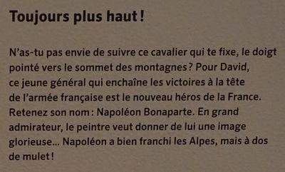 Commandé par le roi d’Espagne soucieux de conserver de bons rapports diplomatiques avec la France, ce portrait équestre fait entrer le consul Bonaparte dans la légende. Le cheval cabré, le vent qui gonfle le manteau, le doigt levé, les inscriptions rappelant les illustres prédécesseurs (Hannibal et Charlemagne), les nuages qui s’écartent aux rayons du soleil... tout concourt à idéaliser le modèle. Le chef de guerre en gloire se métamorphose en homme providentiel pour la France. |