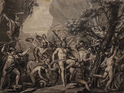 Jacques-Louis David. Léonidas aux Thermopyles, 1813. Plume, encre noire, lavis gris et rehauts de blanc sur crayon noir, mis au carreau à la pierre noire. Paris, musée du Louvre, département des Arts graphiques.