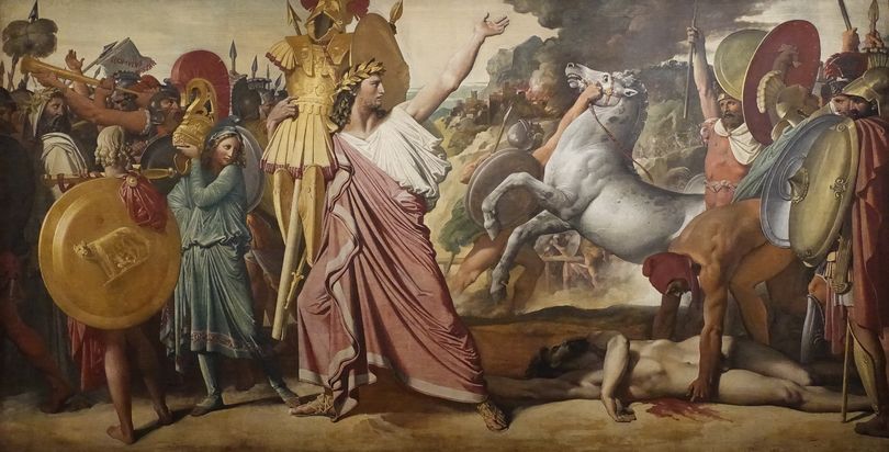 Élève de David de 1797 à 1801, Ingres a été un témoin privilégié de l’exécution des Sabines par son maître. Il lui rend hommage à l’occasion d’une commande reçue en 1811 pour décorer le palais de l’empereur Napoléon Ier à Rome. Le sujet met en scène Romulus triomphant du roi de la cité voisine de Caenina, tué en combat singulier. Ingres reprend la composition et les couleurs des Sabines, mais renonce à la nudité héroïque. |