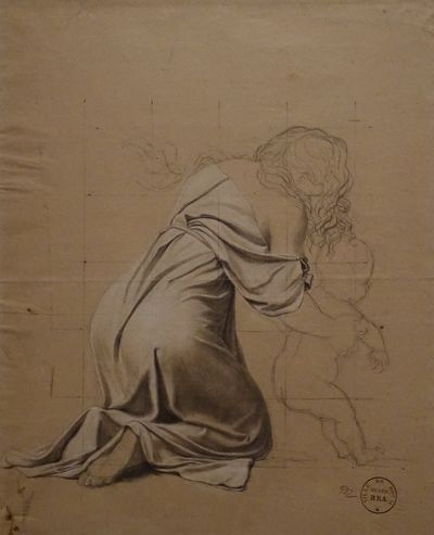 Jacques-Louis David. Une Sabine, agenouillée, soulevant un enfant nu, étude pour Les Sabines, vers 1798. Mine de plomb, pierre noire, estompe et rehauts de blanc, mis au carreau à la mine de plomb. Douai, musée de la Chartreuse. |
