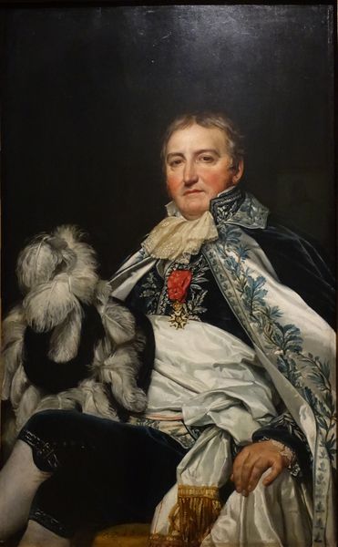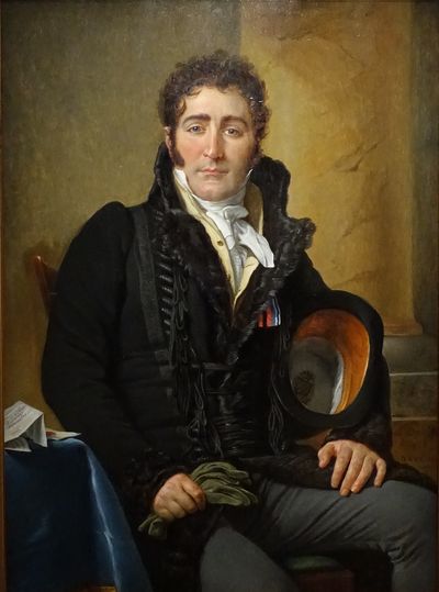 Ancien révolutionnaire, le modèle incarne les récompenses dont sont comblés les hommes de talent ralliés à l'Empire. Il pose en grand costume de conseiller d’État, arborant la croix de grand officier de la Légion d'honneur qu’il vient juste de recevoir. Le point de vue en légère contre-plongée accentue le faste du costume et le sentiment de supériorité du modèle. |