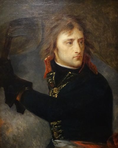 David n’a pas eu la primeur des portraits publics du général Bonaparte. Il a été précédé, entre autres, par son ancien élève Gros, présent en Italie lorsque Bonaparte y remporte sa première campagne en tant que commandant d'armée. Gros mêle ici les genres du portrait et de la peinture d’histoire, car il représente le général dans l’élan d’une attaque décisive, se retournant sur ses hommes pour les entraîner. |