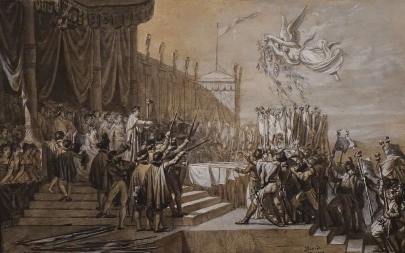 Trois jours après le sacre de Napoléon Ier à Notre-Dame, une cérémonie militaire au Champ-de-Mars est organisée. Elle met en scène le serment prêté par l’armée au nouvel empereur. David imagine une composition théâtrale, survolée par une figure de Victoire dispensant ses faveurs aux soldats. Pour la grande toile achevée en 1810 (exposée au château de Versailles), l'Empereur fera supprimer cette allégorie, ainsi que la présence de Joséphine dont il a divorcé entre-temps. |